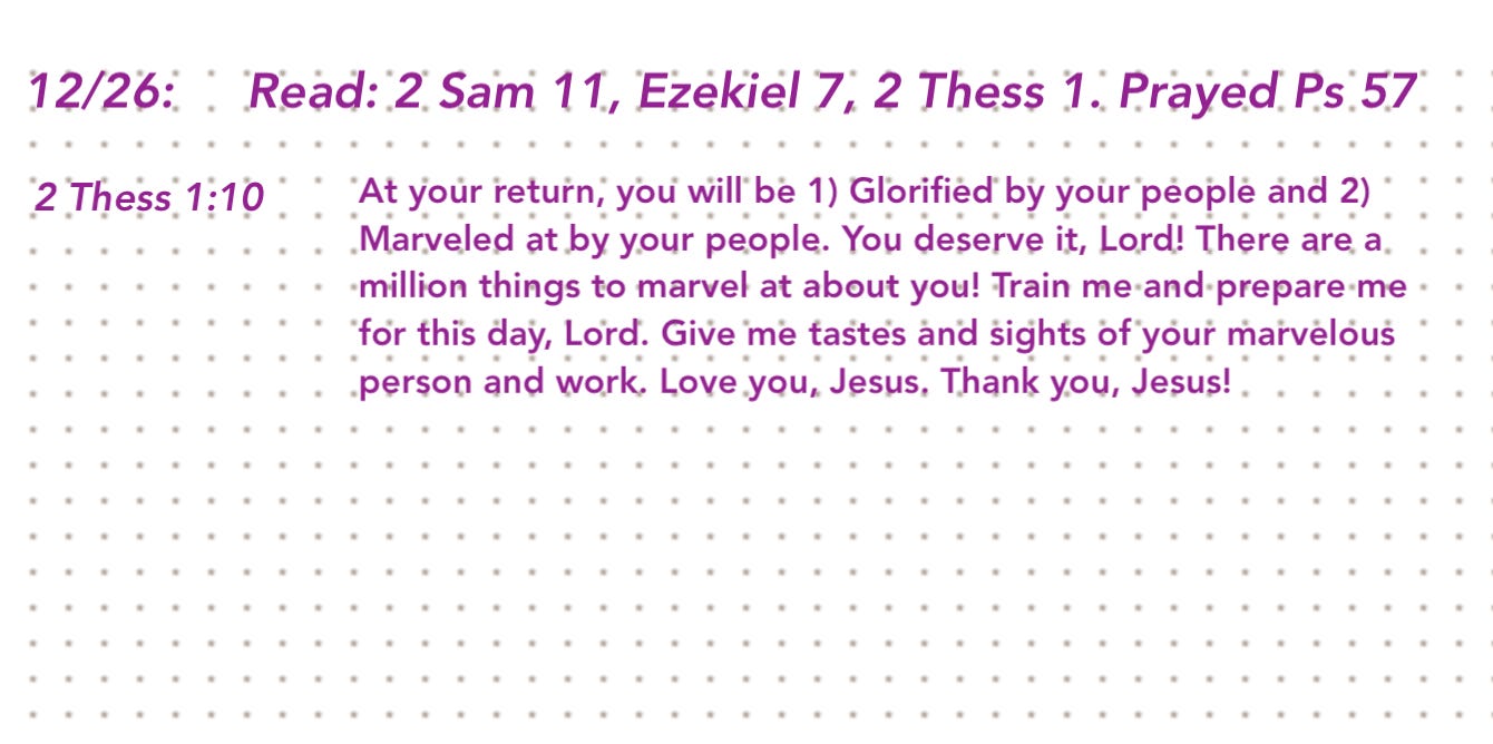 I use these pages by writing the date, and then next to that I write down what I read, and what Psalm I prayed through. Underneath this, on the left margin, I write any Scripture reference that I want to mediate on or pray. Most days I’ll have 2-3 jots, but on 12/26 I wrote one based on 2 Thess 1:10, “On that day when he comes to be glorified by his saints and to be marveled at by all those who have believed, because our testimony among you was believed.” Here's what I wrote on this verse after meditating on the world “marvel.”