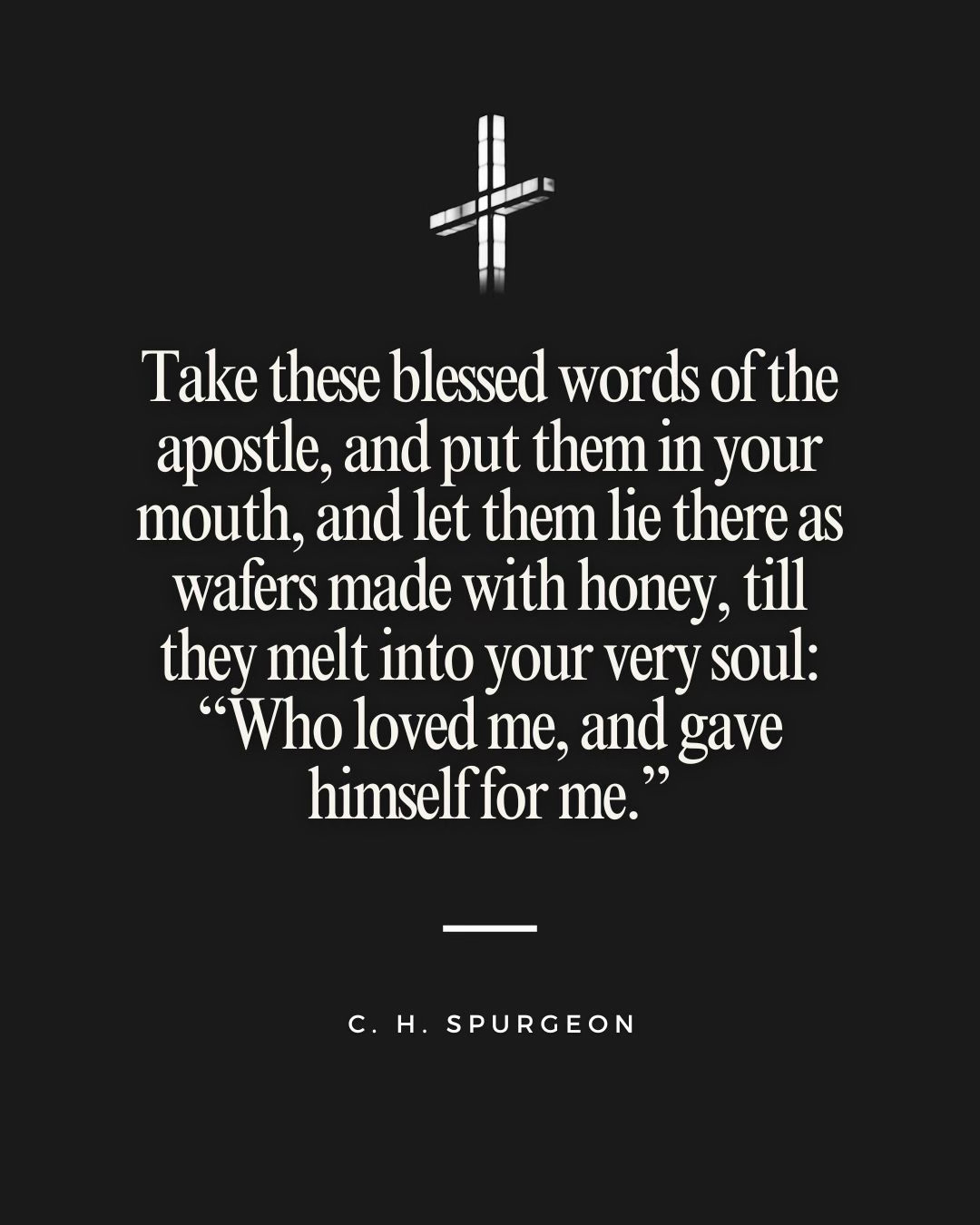 In the scourging, the shame, the spitting, the bloody sweat, the crucifixion, he gave himself for you. Take these blessed words of the apostle, and put them in your mouth, and let them lie there as wafers made with honey, till they melt into your very soul: “Who loved me, and gave himself for me.”