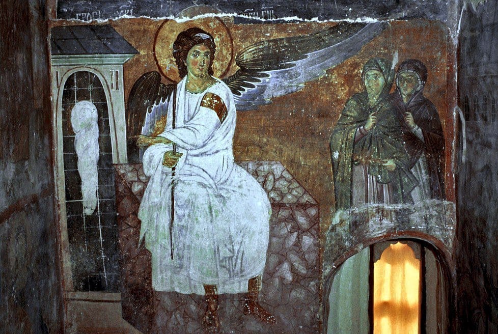 The angel sitting on the stone shows us that it’s time to rejoice that Christ “has risen, just as he said” (Matthew 28:6). There isn’t a dead man here. Let’s all rest in Christ.
